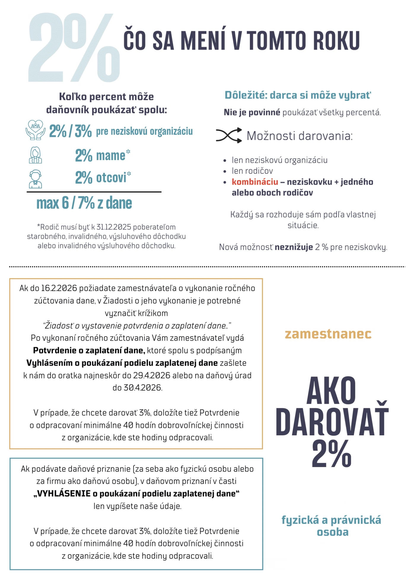 | 30. 04. 2026 | Posledný termín pre zamestnancov na podanie Vyhlásenia o poukázaní 2% z dane (spolu s Potvrdením o zaplatení dane). |